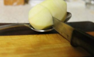 Картофель очистить, помыть и обсушить бумажным полотенцем. Положить в столовую ложку и сделать поперечные разрезы. Благодаря ложке вы не разрежете картофель пополам.