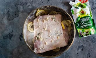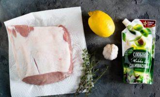 • Лимон нарежьте крупными дольками. В глубокой миске соедините резаный лимон, выжмите из него сок, затем добавьте раздавленный чеснок, листочки тимьяна, соль, перец и майонез. Хорошо перемешайте.