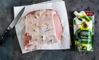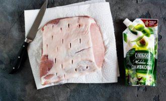 • Мясо промойте и обсушите бумажным полотенцем. Ножом сделайте хаотичные разрезы глубиной 2 см.
