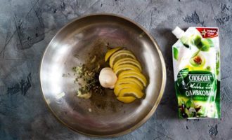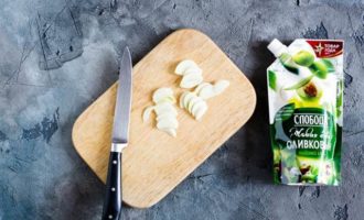 • Чеснок очистите и 3 дольки тонко нарежьте, а остальные раздавите плоской стороной ножа.