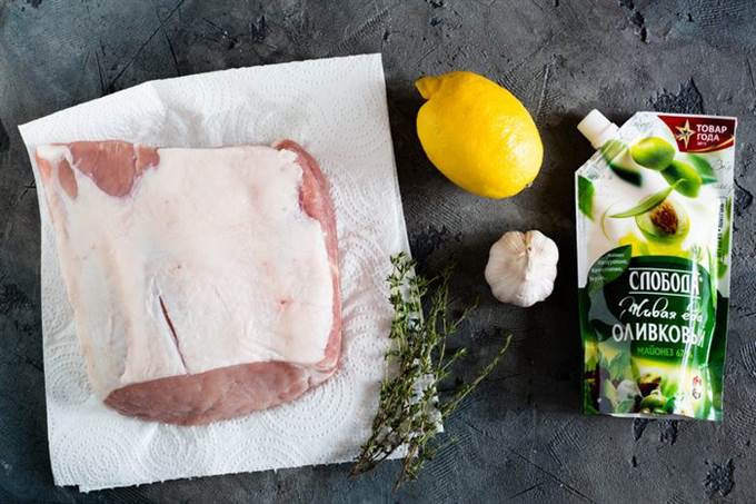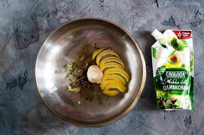 • Лимон нарежьте крупными дольками. В глубокой миске соедините резаный лимон, выжмите из него сок, затем добавьте раздавленный чеснок, листочки тимьяна, соль, перец и майонез. Хорошо перемешайте.