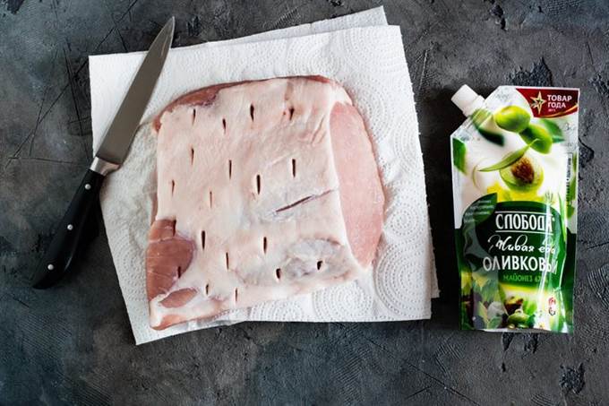 • Мясо промойте и обсушите бумажным полотенцем. Ножом сделайте хаотичные разрезы глубиной 2 см.