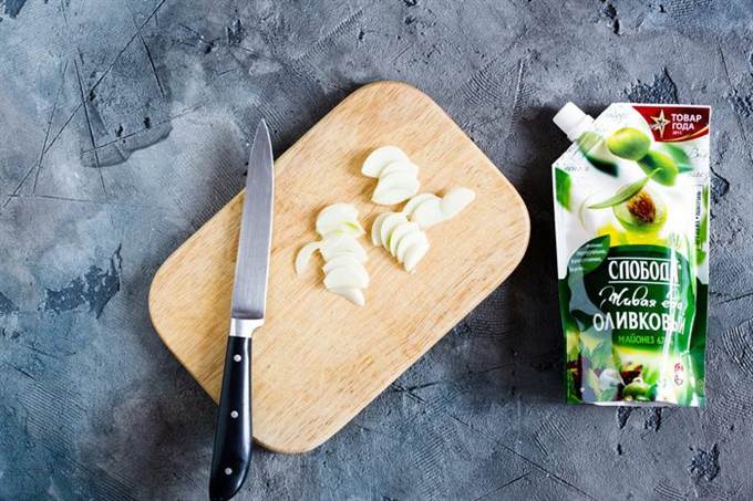 • Чеснок очистите и 3 дольки тонко нарежьте, а остальные раздавите плоской стороной ножа.