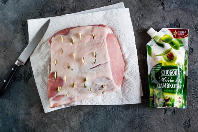 • Затем нашпигуйте мясо резанными дольками чеснока и листочками тимьяна.