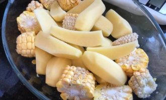 • Кукурузу и картофель почистите, нарежьте ломтиками и выложите в форму для запекания.