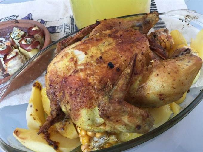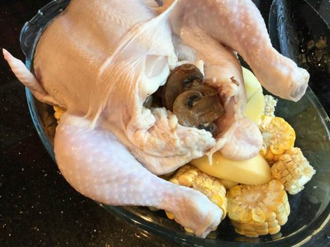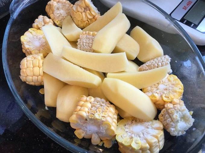 • Кукурузу и картофель почистите, нарежьте ломтиками и выложите в форму для запекания.