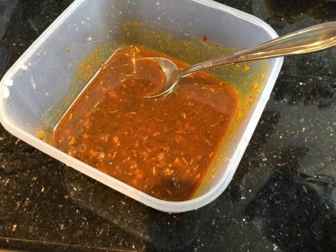 • В отдельной миски смешайте 3 ст. л. оливкового масла, паприку, куркуму, прованские травы, соль, перец и выдавленный прессом чеснок. Хорошо натрите полученной смесью курицу и выложите в форму для запекания на овощи.