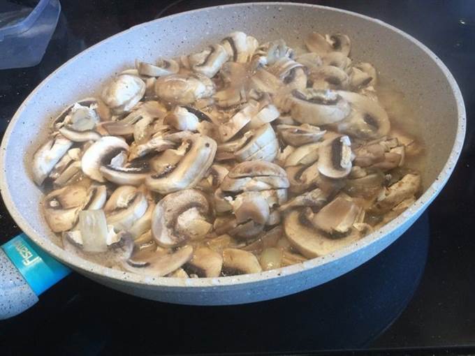 • Тонко нарежьте грибы и добавьте к луку и жарьте пока не дадут сок. Посолите и поперчите, жарьте до готовности, около 10 минут.