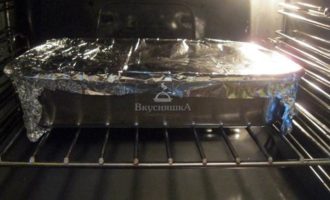 Сверху форму для запекания обвернуть фольгой. Запекать курицу с тыквой в духовке при температуре 180°C в течении 35 минут.
