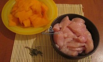 Для приготовления нам понадобятся куриное филе, мякоть тыквы, розмарин, специи для тыквы, соль и перец.