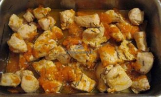 Обжаренную курицу с тыквой выложить в форму для запекания, посолить и посыпать розмарином.