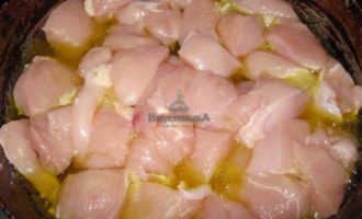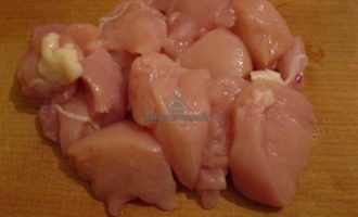 Куриное филе вымыть и нарезать крупными кусками.