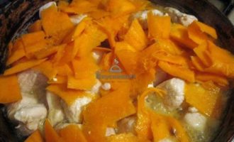 Добавить к курице тыкву и обжаривать в течении 5 минут.