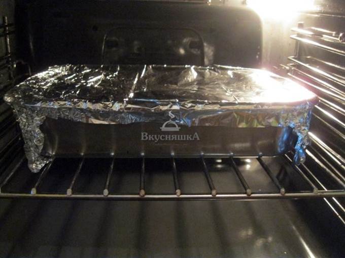 Сверху форму для запекания обвернуть фольгой. Запекать курицу с тыквой в духовке при температуре 180°C в течении 35 минут.