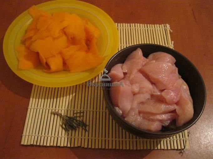 Для приготовления нам понадобятся куриное филе, мякоть тыквы, розмарин, специи для тыквы, соль и перец.