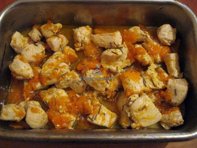 Обжаренную курицу с тыквой выложить в форму для запекания, посолить и посыпать розмарином.