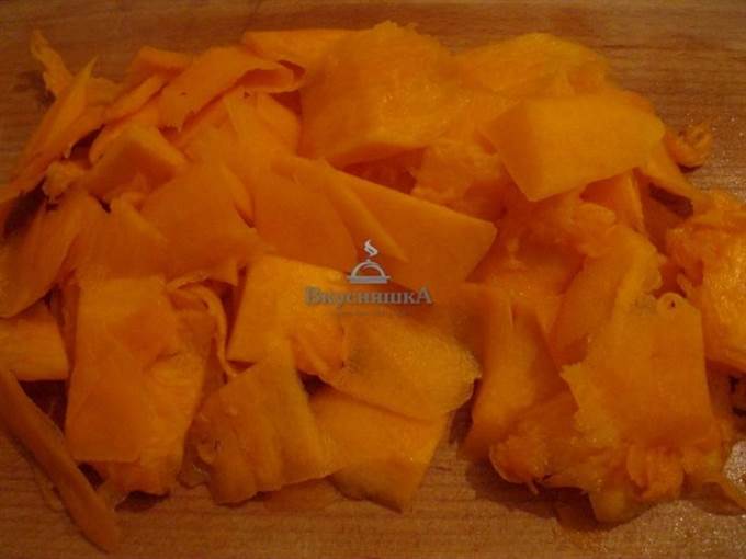 Мякоть тыквы вымыть и нарезать кубиками.