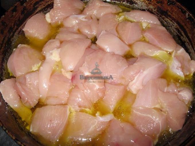 Нарезанное куриное филе обжарить в горячем масле со специями.
