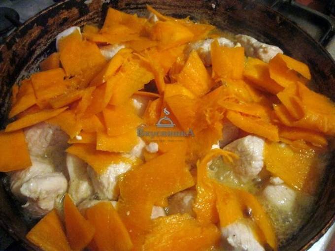 Добавить к курице тыкву и обжаривать в течении 5 минут.