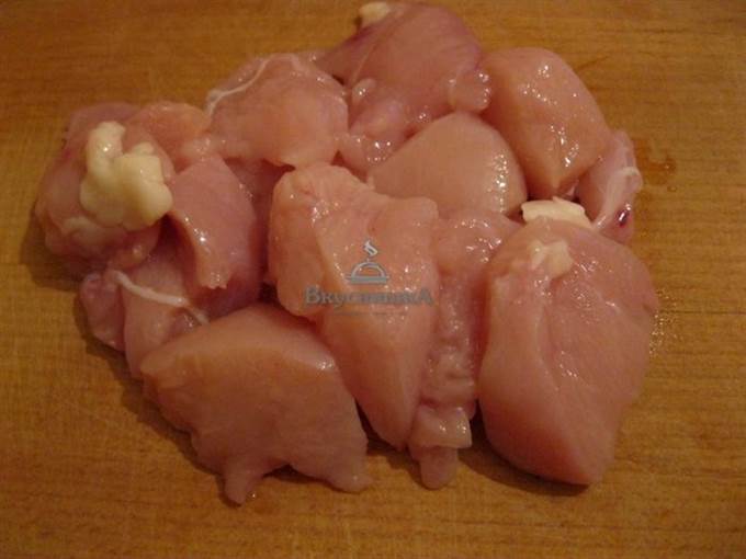 Куриное филе вымыть и нарезать крупными кусками.