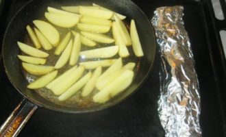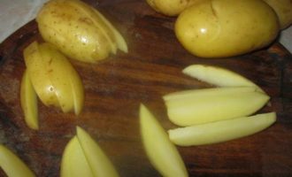 На гарнир нарезал молодую картошку, сложил в форму, сбрызнул подсолнечным маслом и посолил.