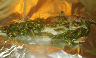 Рыбу выложил на фольгу, наполнил брюшко ароматной смесью, а все что не влезло, выложил на тушку. Фольгу плотно свернул конвертиком.