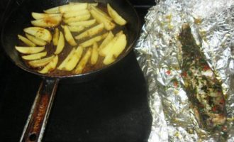 Конвертик с рыбой и форму с картошкой поставил в разогретую до 120 градусов духовку на полчаса. Через полчаса развернул конверт и включил на пять минут гриль. И все готово!