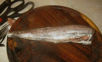 Минтай разморозил, выпотрошил и срезал ножницами все плавники. Чтобы не было неприятного запаха, промыл всю тушку уксусом.