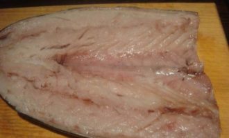Чстим скумбрию через спинку. Отрезаем голову и плавники, тщательно вынимаем кости.