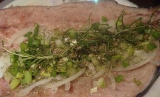 Рыбу солим, выкладываем нарезанный полукольцами репчатый лук, зеленый лук, розмарин, майоран, чабрец (травы можно брать сухие, а можно и свежие у меня на данный момент был свежий только розмарин).