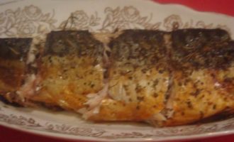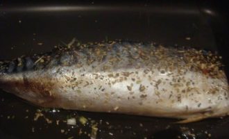 Закрываем тушку. Рыбку кладем в форму (я форму смазала немного растительным маслом). Сверху рыбку посыпать немного сухими майораном и чабрецом.