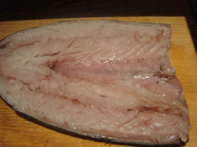 Чстим скумбрию через спинку. Отрезаем голову и плавники, тщательно вынимаем кости.