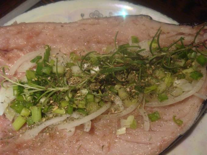 Рыбу солим, выкладываем нарезанный полукольцами репчатый лук, зеленый лук, розмарин, майоран, чабрец (травы можно брать сухие, а можно и свежие у меня на данный момент был свежий только розмарин).