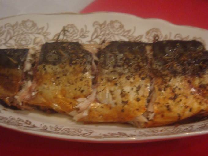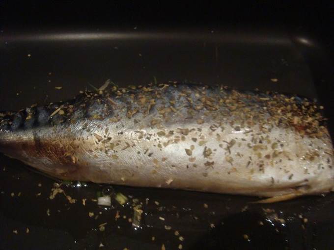 Закрываем тушку. Рыбку кладем в форму (я форму смазала немного растительным маслом). Сверху рыбку посыпать немного сухими майораном и чабрецом.