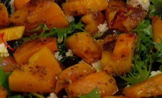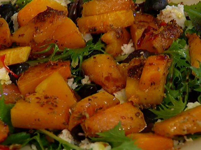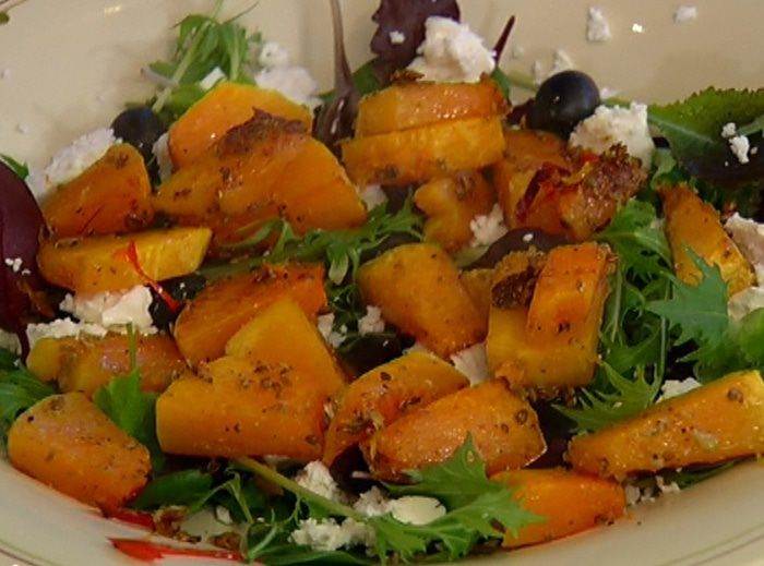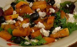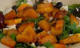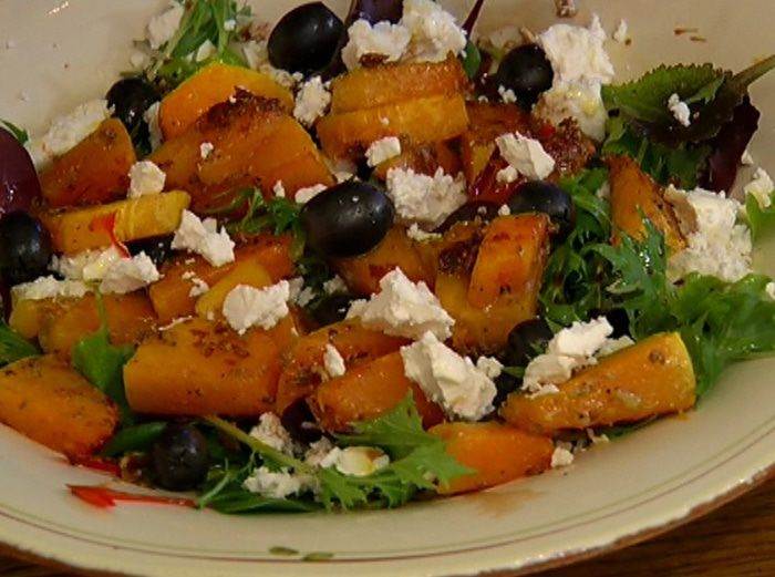 Салатный микс выложить на блюдо, посолить, поперчить, разложить часть оливок, сверху покрошить половину феты и выложить запеченную тыкву.