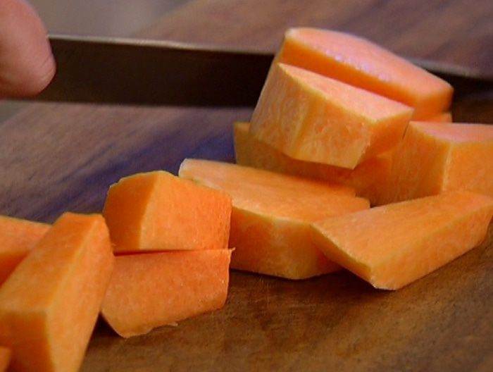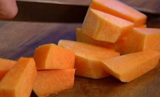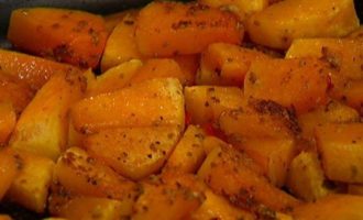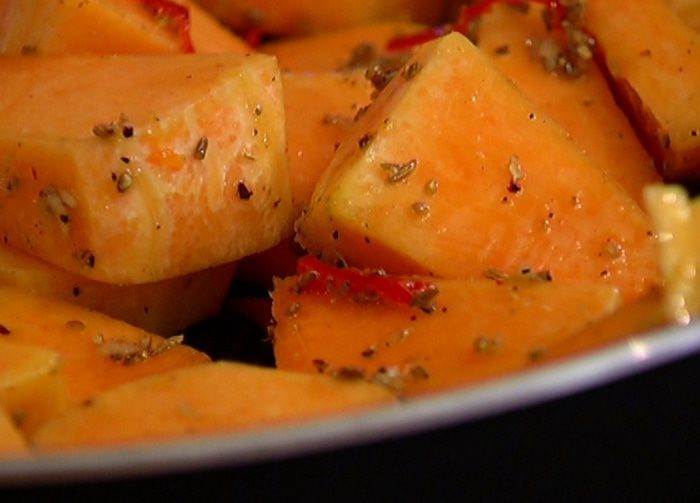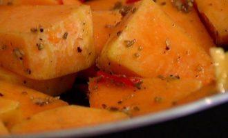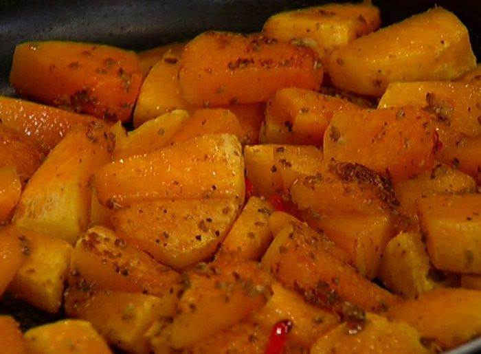 Выложить тыкву в форму для запекания и смазать острой заправкой.