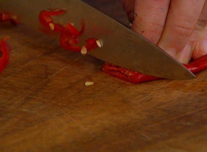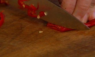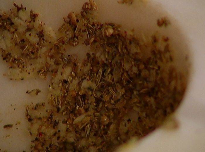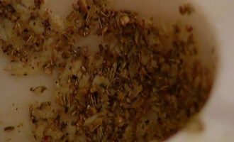 Чеснок, фенхель, кориандр, щепотку черного перца и соли растереть в ступке, добавить перец чили и 1-2 ст. ложки оливкового масла, перемешать.