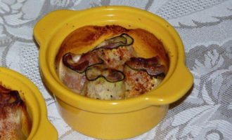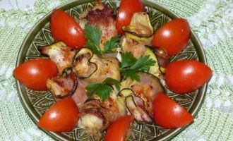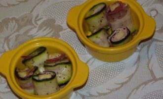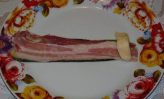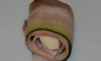 • Бекон разрезать вдоль напополам, сыр разрезать на брусочки. На каждую полоску цукини положить бекон и сыр.