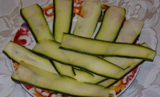 • Цукини нарезать вдоль с помощью овощерезки тонкими слайсами.