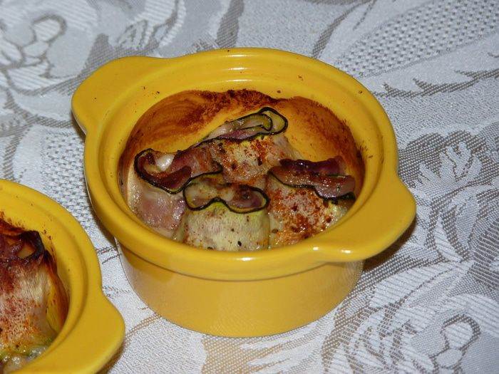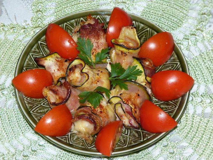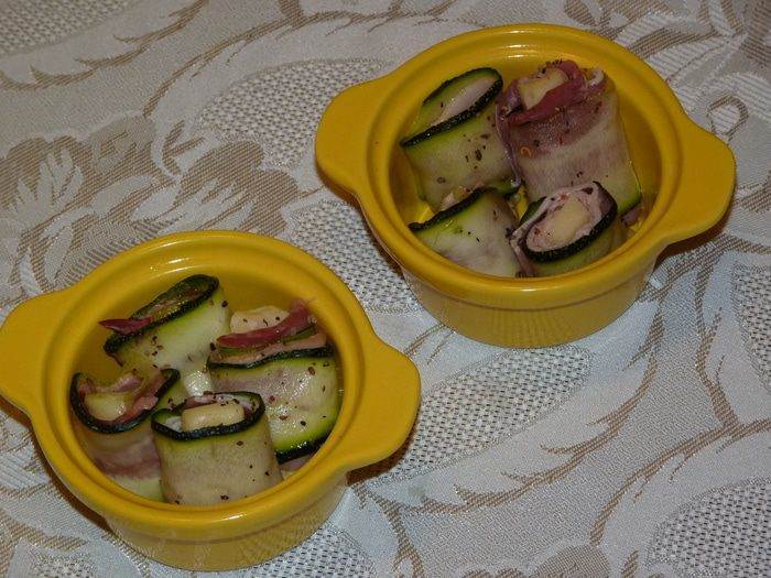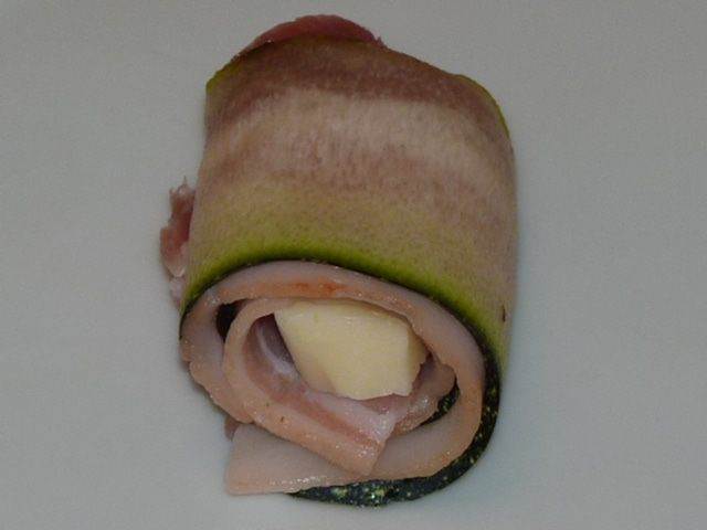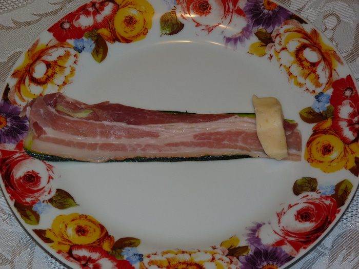 • Бекон разрезать вдоль напополам, сыр разрезать на брусочки. На каждую полоску цукини положить бекон и сыр.