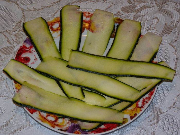 • Цукини нарезать вдоль с помощью овощерезки тонкими слайсами.