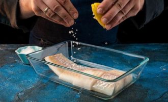 • Филе нарезать на куски, посолить, поперчить и сбрызнуть соком лимона.