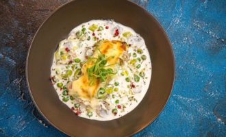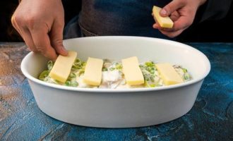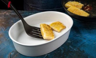 • Разогреть в сковороде сливочное масло и обжарить рыбу с двух сторон, до румяной корочки. Переложить рыбу в форму для запекания.