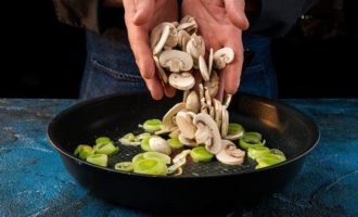 • В сковороде разогреть оливковое масло, выложить порезанный кольцами лук и слегка обжарить. Добавить нарезанные шампиньоны, немного потушить.