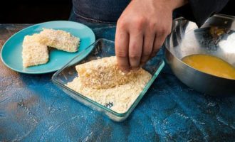 • Яйцо взбить слегка вилкой, обмакнуть каждый кусок рыбы. Затем обвалять в сухарях.