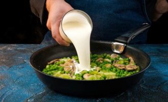 • Добавить зеленый горошек, продолжая обжаривать. Влить сливки и потушить все минут 5, посолить по вкусу.