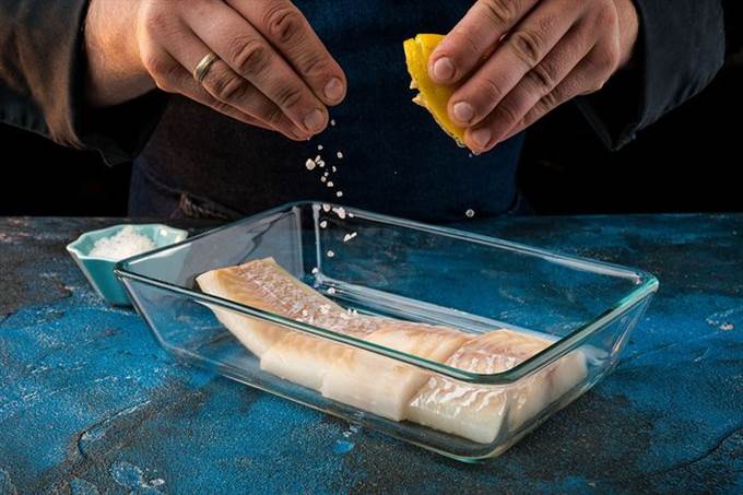 • Филе нарезать на куски, посолить, поперчить и сбрызнуть соком лимона.