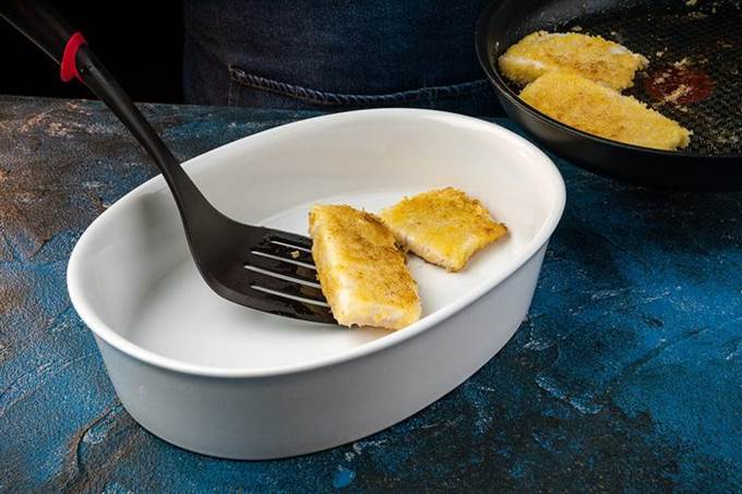 • Разогреть в сковороде сливочное масло и обжарить рыбу с двух сторон, до румяной корочки. Переложить рыбу в форму для запекания.