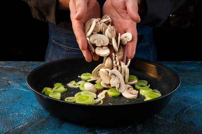 • В сковороде разогреть оливковое масло, выложить порезанный кольцами лук и слегка обжарить. Добавить нарезанные шампиньоны, немного потушить.