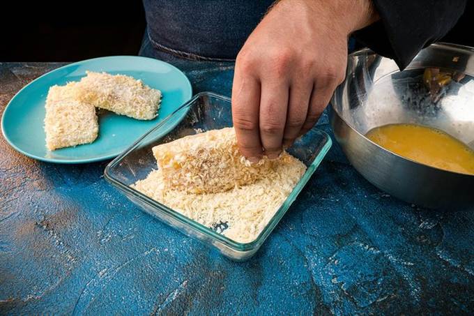 • Яйцо взбить слегка вилкой, обмакнуть каждый кусок рыбы. Затем обвалять в сухарях.